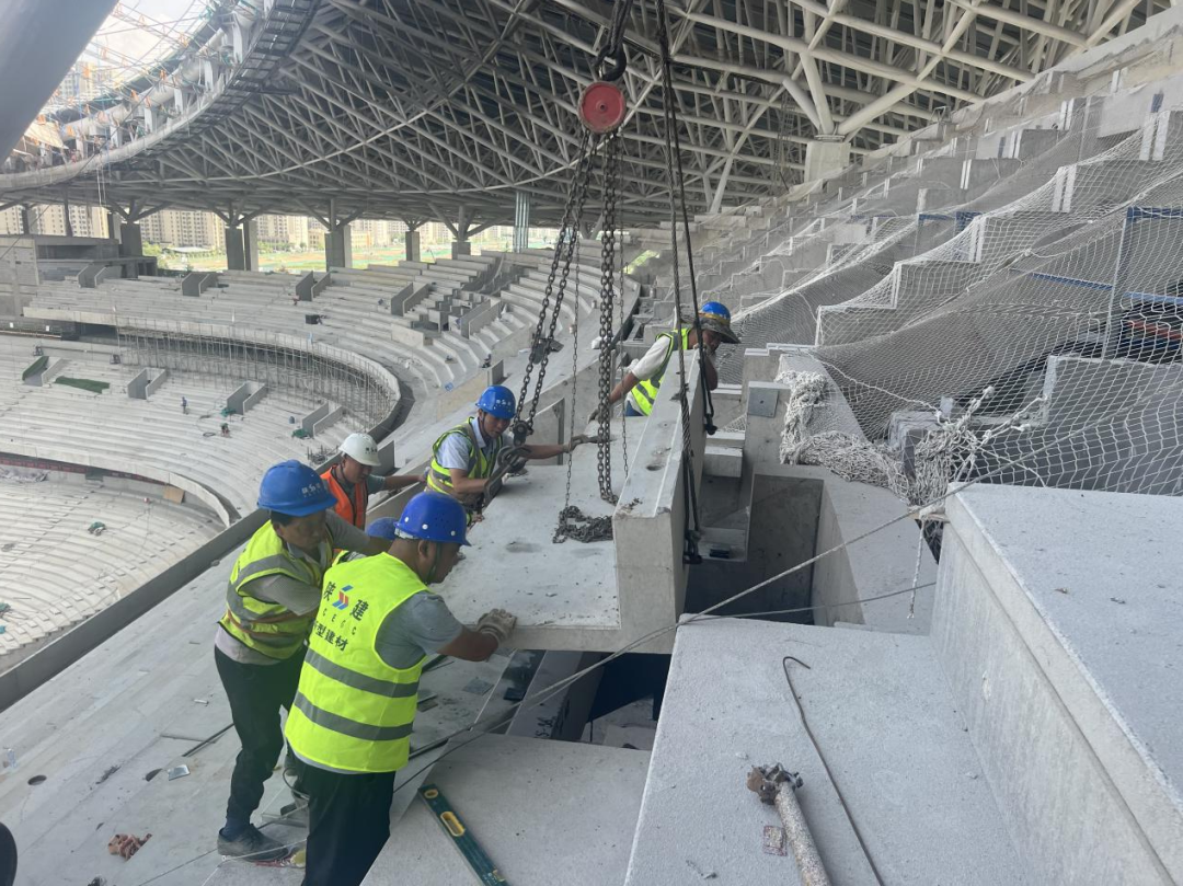 足球中心項(xiàng)目現(xiàn)場(chǎng),預(yù)制看臺(tái)吊裝進(jìn)入到最后也是最難的高區(qū)吊裝環(huán)節(jié),場(chǎng)館屋頂索網(wǎng)施工完成后,對(duì)高區(qū)看臺(tái)吊裝來(lái)說(shuō)更是嚴(yán)峻的挑戰(zhàn),斜角吊裝,角度稍有偏差,就可能碰到頂部鋼索或傷到安裝工人,烈日“炙烤”下,更需要作業(yè)人員沉著冷靜、膽大心細(xì),嚴(yán)格按照施工工藝要求,做到盡善盡美,完美實(shí)現(xiàn)設(shè)計(jì)方高標(biāo)準(zhǔn)要求。