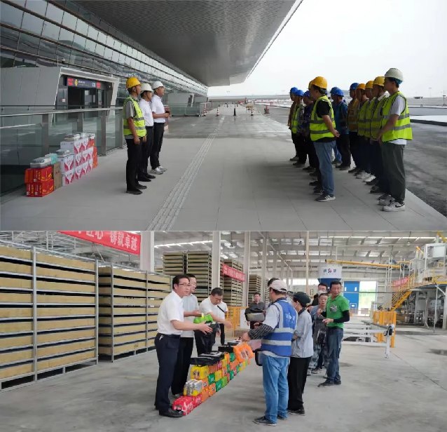 集團(tuán)副總經(jīng)理劉海生赴機(jī)場(chǎng)供貨項(xiàng)目一線,與華山路橋集團(tuán)共同開(kāi)展送清涼慰問(wèn)活動(dòng)。同時(shí),走進(jìn)免拆保溫模板基地開(kāi)展慰問(wèn)活動(dòng),親切地詢問(wèn)了職工們工作與生活情況,叮囑他們高溫作業(yè)要注意勞逸結(jié)合,做好防暑降溫工作,在保證安全生產(chǎn)的同時(shí)做好自我防護(hù),確保以更好的狀態(tài)投入到工作中。