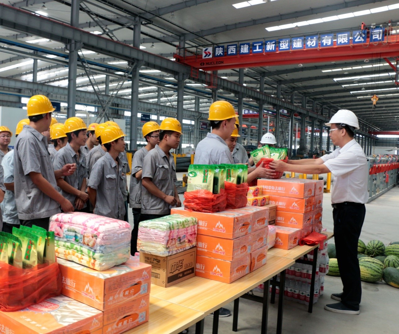 本次送清涼活動(dòng),先后走訪4個(gè)子公司,將綠豆、白糖、菊花、金銀花、藿香正氣水、清涼油、西瓜、飲料等防暑降溫用品送到一線職工和農(nóng)民工手中。每到一個(gè)項(xiàng)目,張朝輝、王拯民都要帶領(lǐng)慰問(wèn)組成員仔細(xì)查看施工現(xiàn)場(chǎng),檢查辦公區(qū)和生活區(qū)衛(wèi)生、勞動(dòng)保護(hù)等情況,詳細(xì)詢問(wèn)防暑降溫措施落實(shí)情況,叮囑項(xiàng)目部要做好暑期的施工安排,合理調(diào)整現(xiàn)場(chǎng)作息時(shí)間,高度重視安全,做好防暑降溫工作,切實(shí)保證全體一線作業(yè)人員的身體健康。